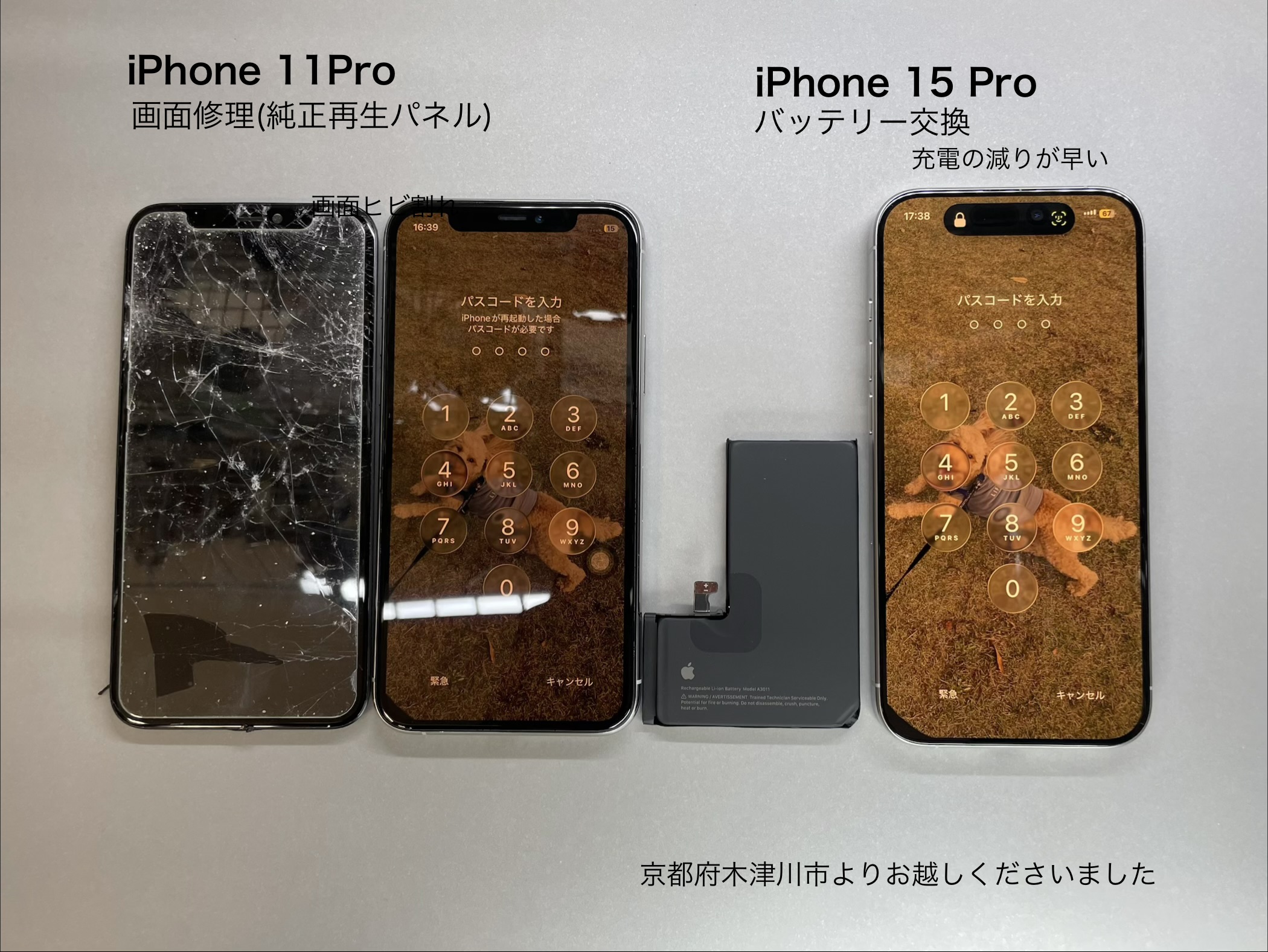 今回ご紹介させて頂きます、iPhone修理は京都府木津川市からお越しのお客様より2台分をお持ち込みくださり、iPhone 15Proはバッテリーの交換、iPhone 11 Proは画面修理のご依頼です。