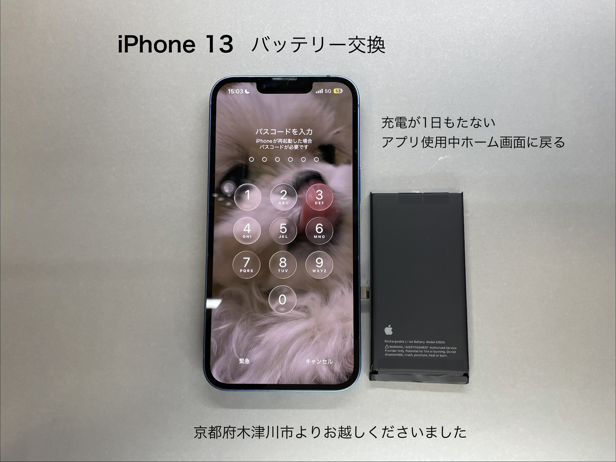 今回ご紹介させて頂きます、iPhone修理は京都府木津川市からお越しのお客様よりiPhone 13のバッテリー交換のご依頼です。
