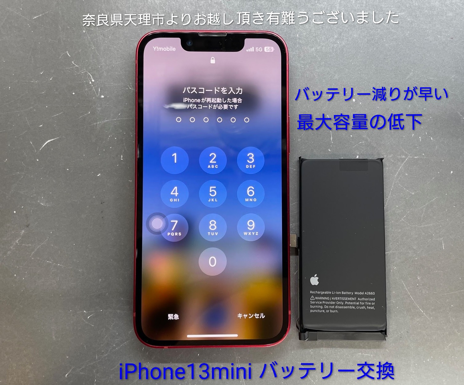 iPhone 13 miniバッテリー交換に奈良県天理市よりお越しくださいました。