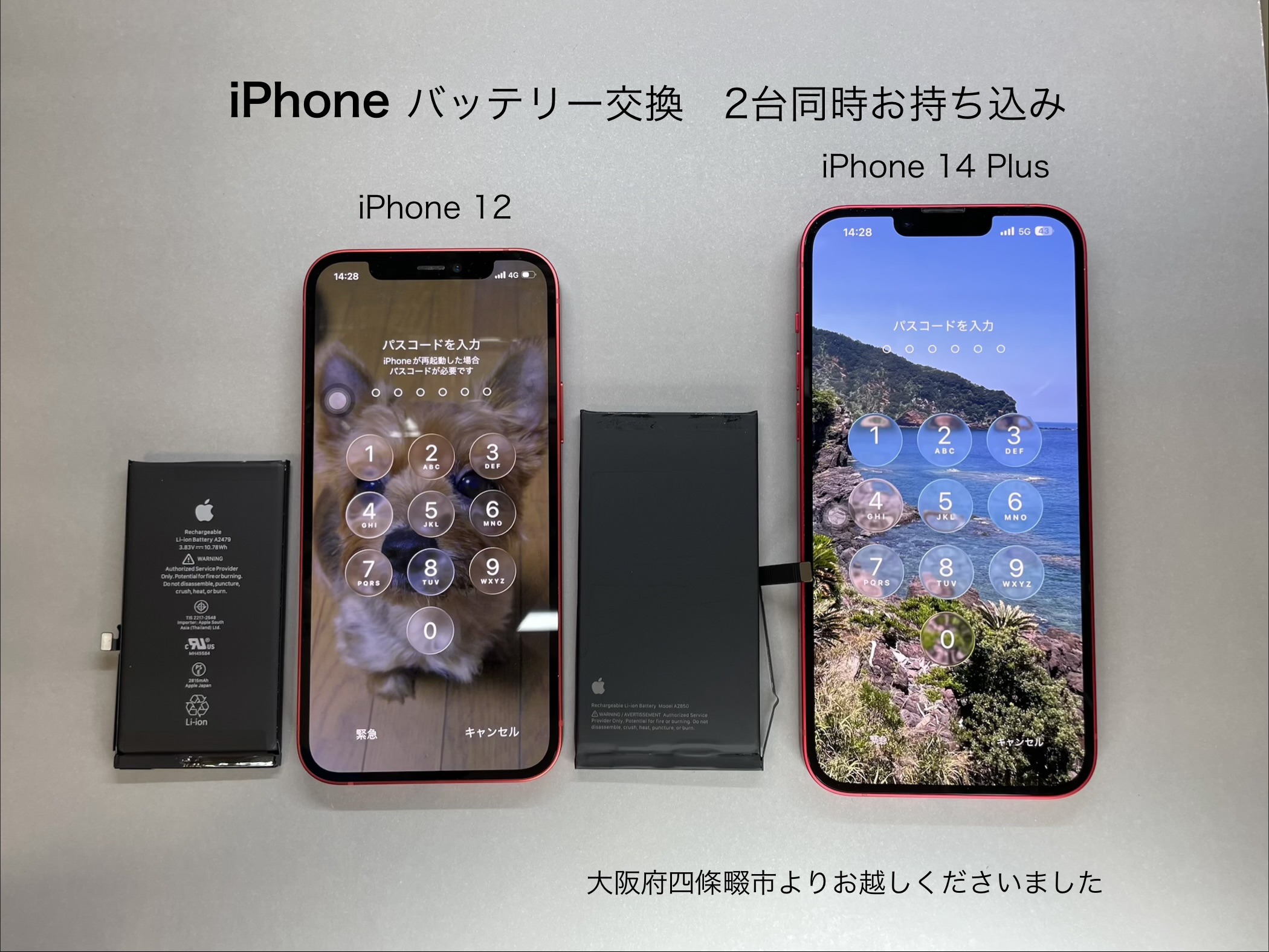 今回ご紹介させて頂きます、iPhone修理は大阪府四條畷市からお越しのお客様よりiPhone 12とiPhone 14 Plusのバッテリー交換を2台同時にお持ちくださいました。