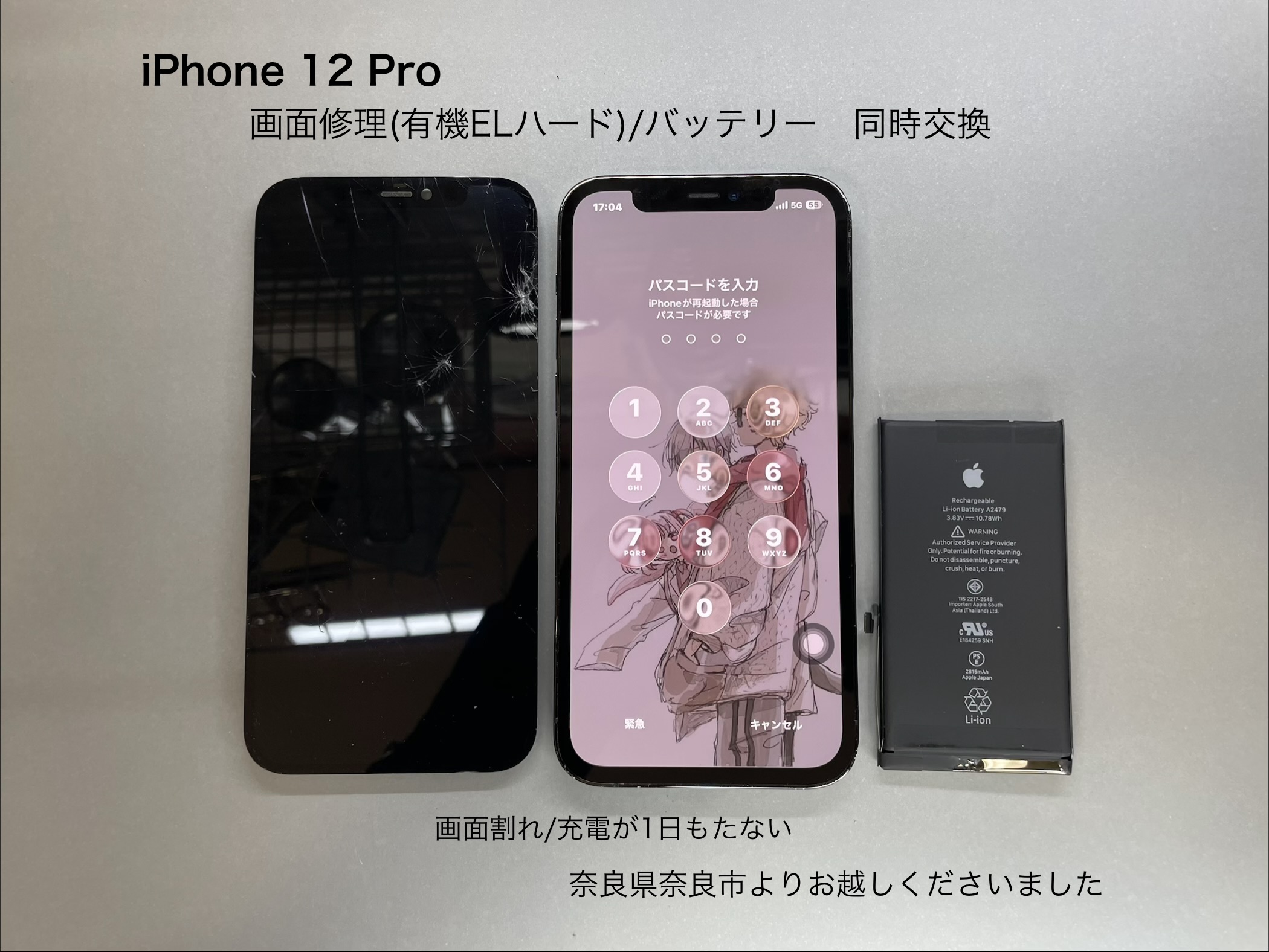 今回ご紹介させて頂きます、iPhone修理は奈良県奈良市からお越しのお客様よりiPhone 12 Proの画面割れとバッテリーの同時交換のご依頼を頂きました。