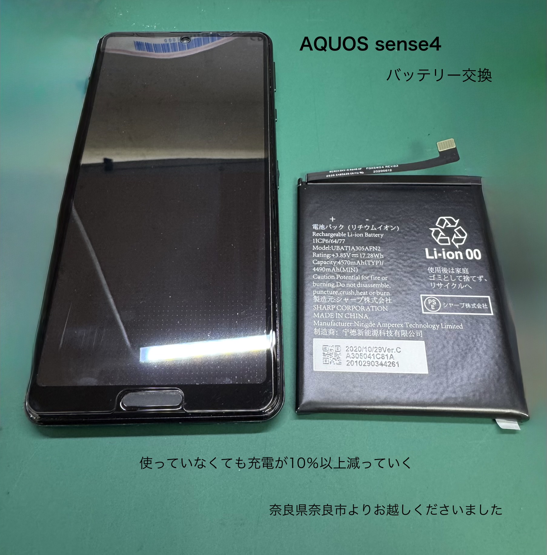 今回ご紹介させて頂きます、スマホ修理は奈良県奈良市からお越しのお客様より、AQUOS sense4のバッテリー交換のご依頼です。
