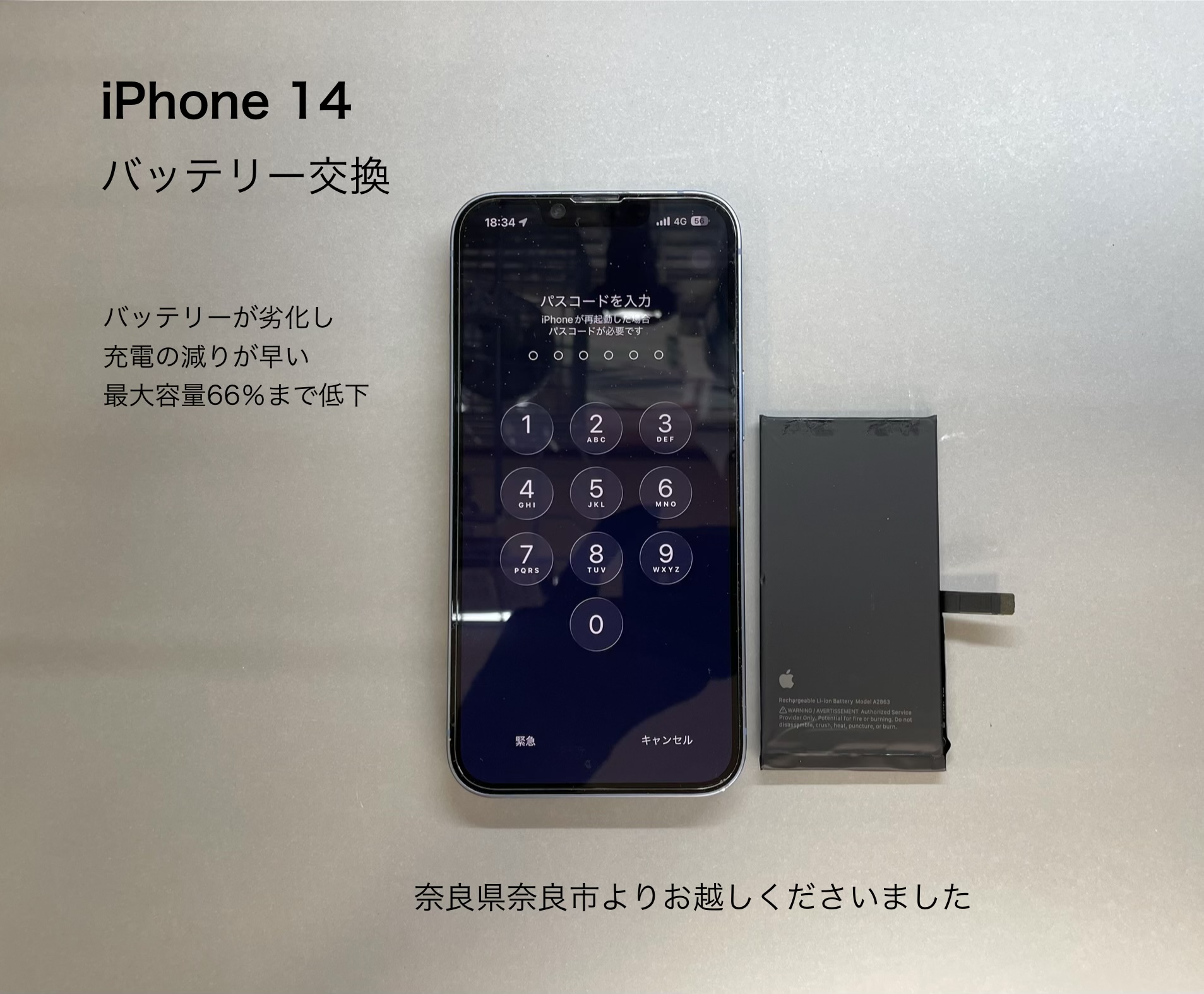 今回ご紹介させて頂きます、iPhone修理は奈良県奈良市からお越しのお客様よりiPhone 14のバッテリー交換のご依頼です。