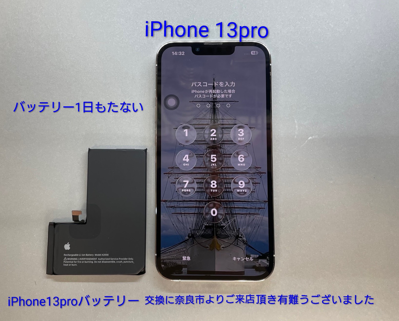 iPhone 13 Pro「バッテリーが1日もたない」「カメラを使用していると直ぐにバッテリーの残量が減る」症状で奈良県奈良市よりバッテリー交換にご来店頂きました。