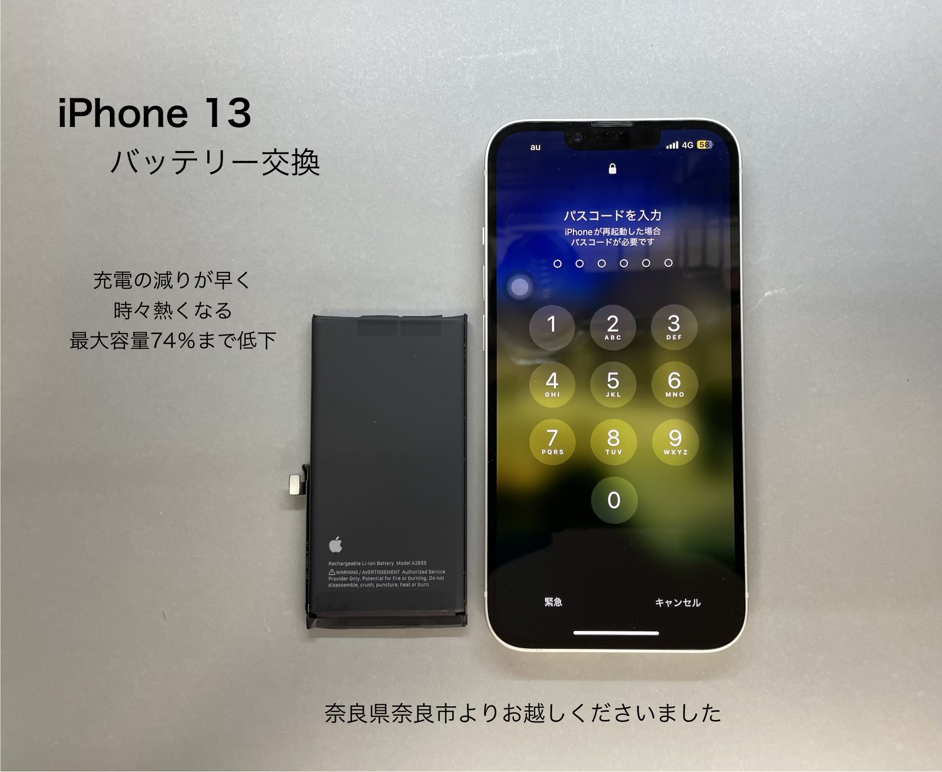 今回ご紹介させて頂きます、iPhone修理は奈良県奈良市からお越しのお客様よりiPhone 13のバッテリー交換のご依頼です。