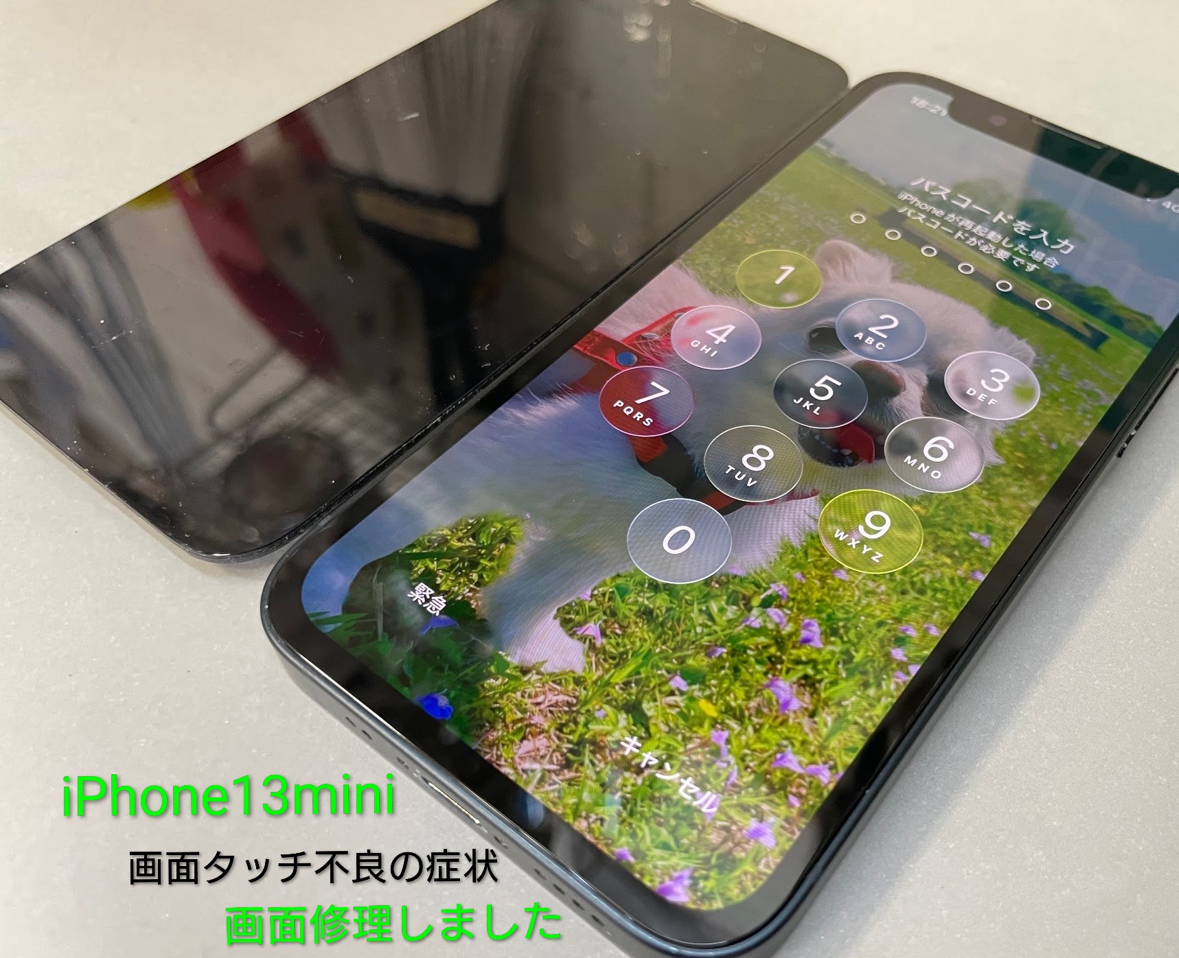 画面修理で緑色に発光していた画面は改善されて、タッチ不良の無いご使用頂けるiPhone 13 miniに改善されました。