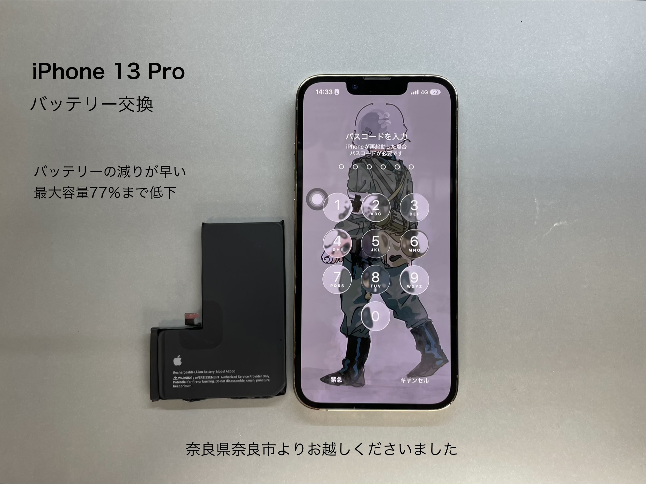 今回ご紹介させて頂きますiPhone修理は奈良県奈良市からお越しのお客様よりiPhone 13 Proのバッテリー交換のご依頼です。