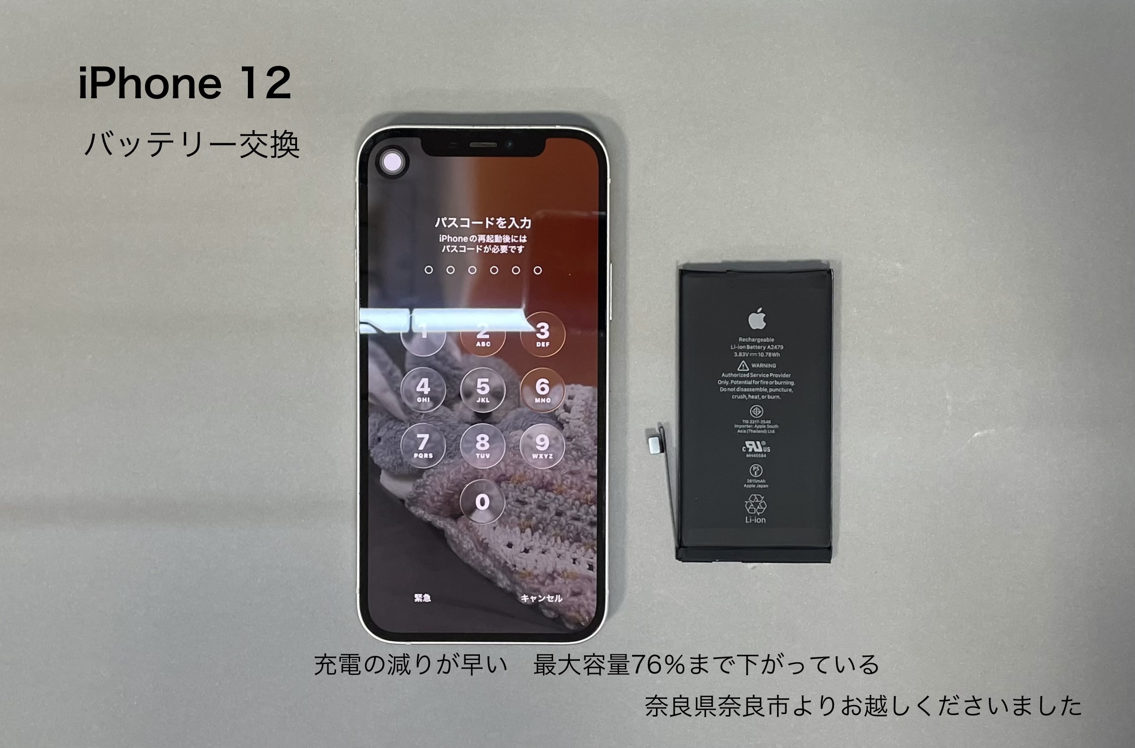 今回ご紹介させて頂きます、iPhone修理は奈良県奈良市からお越しのお客様よりiPhone 12のバッテリー交換のご依頼です。