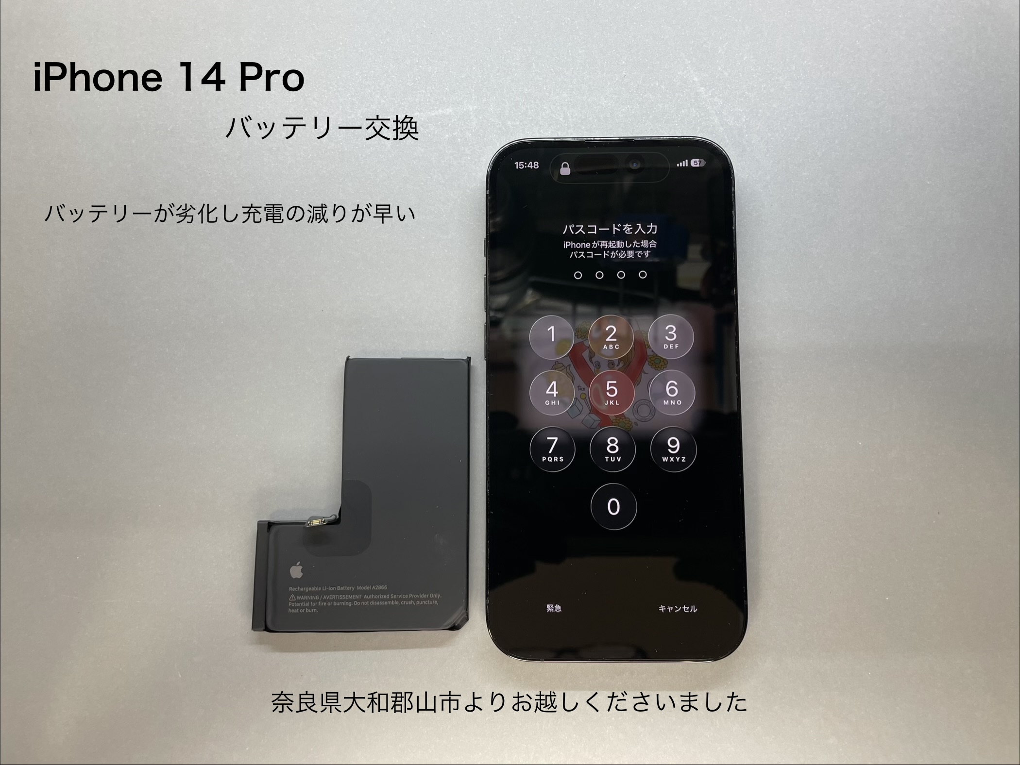 今回ご紹介させて頂きます、iPhone修理は奈良県大和郡山市からお越しのお客様よりiPhone 14 Proのバッテリー交換のご依頼です。