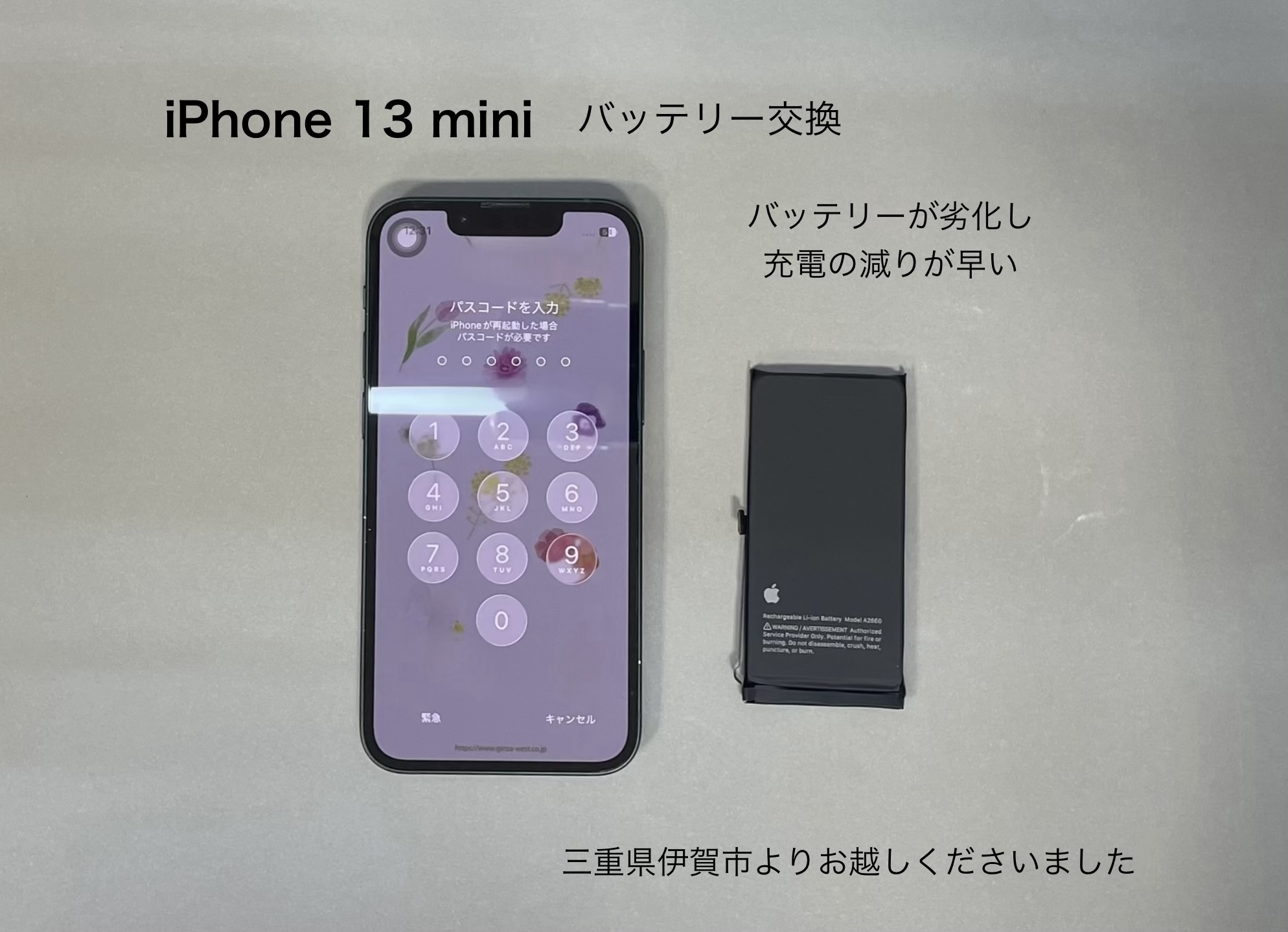 今回ご紹介させて頂きます、iPhone修理は三重県伊賀市からお越しのお客様よりiPhone 13 miniのバッテリー交換のご依頼です。