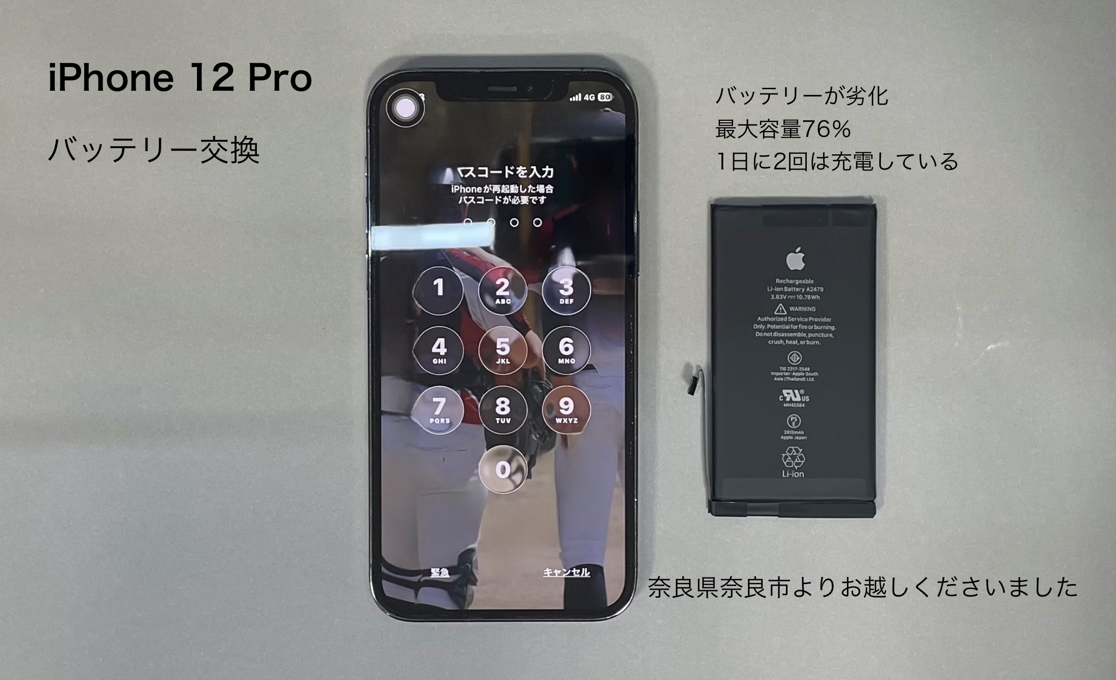 今回ご紹介させて頂きます、iPhone修理は奈良県奈良市からお越しのお客様よりiPhone 12 Proのバッテリー交換のご依頼です。
