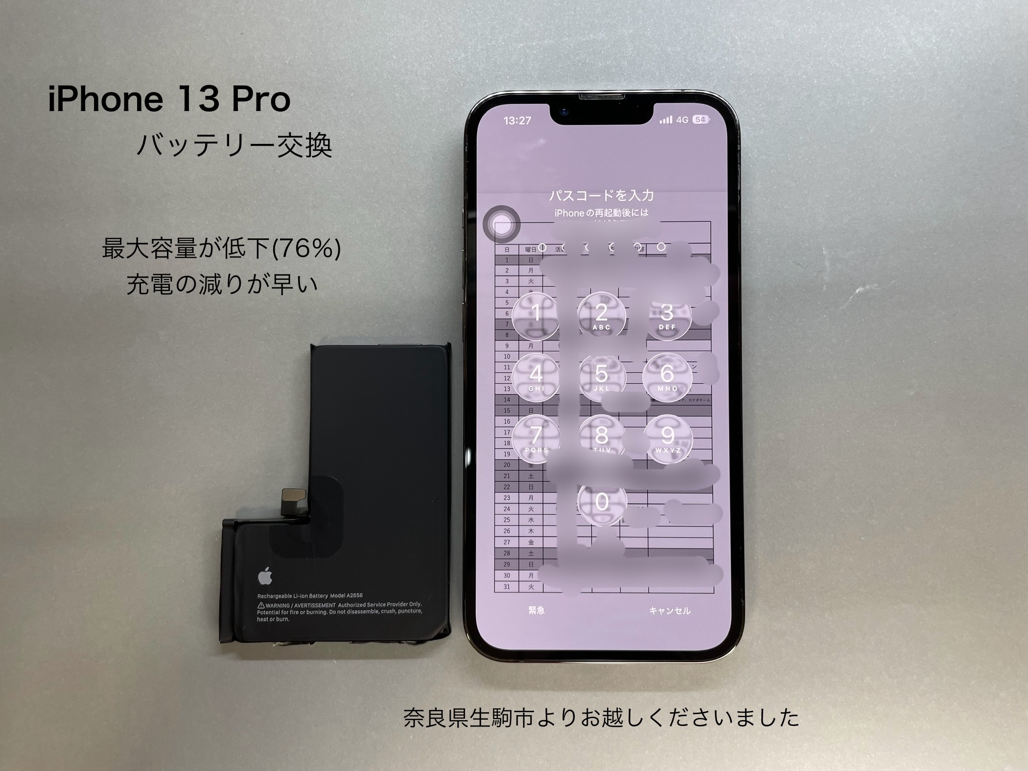 今回ご紹介させて頂きます、iPhone修理は奈良県生駒市からお越しのお客様よりiPhone 13 Proのバッテリー交換のご依頼です。