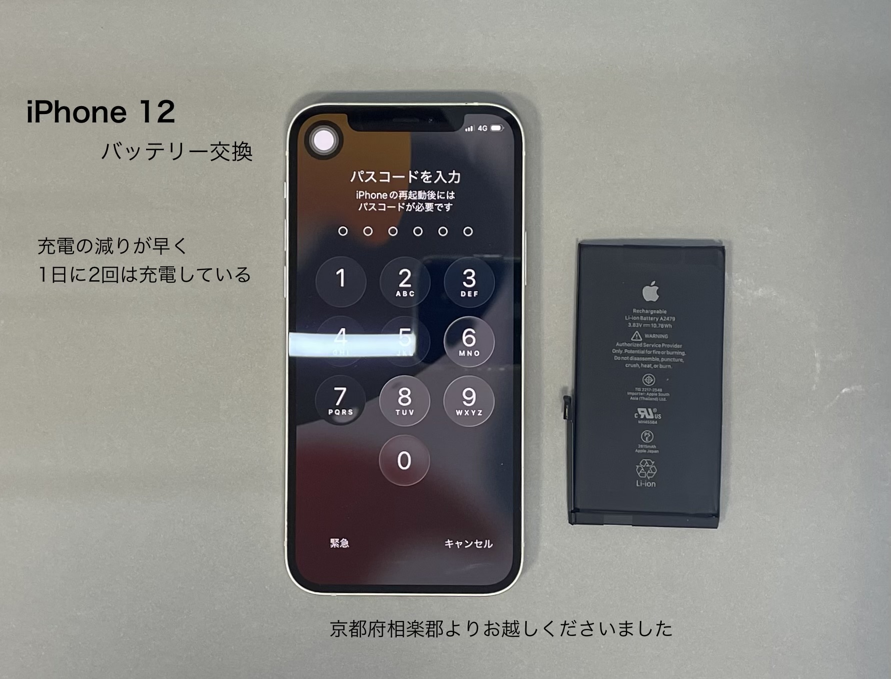 今回ご紹介させて頂きます、iPhone修理は京都府相楽郡からお越しのお客様よりiPhone 12のバッテリー交換のご依頼です。