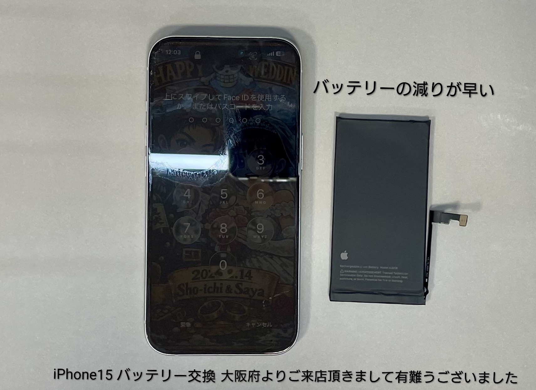 「iPhoneのバッテリー減りが早くて交換に来ました」と大阪府よりiPhone 15バッテリー交換にお越し頂きました。