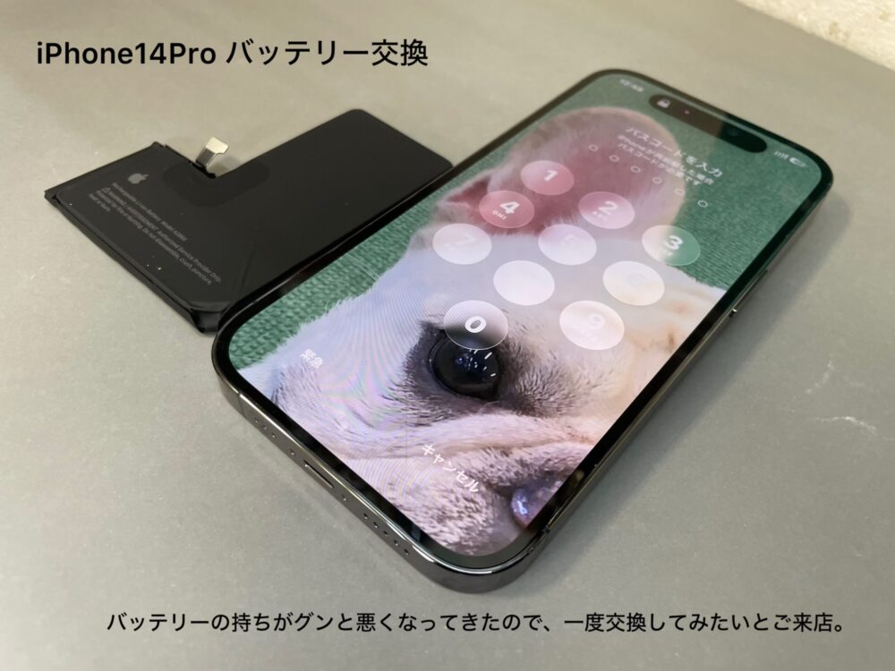 今回ご紹介するのは、iPhone14Proのバッテリー交換。もう4年近く使用されているらしく、減っていくのが大分と早くなっているご様子。お仕事で西大寺に来ることがあり、バッテリー交換をしてみたいと当店カメラアサヒにご来店下さいました。