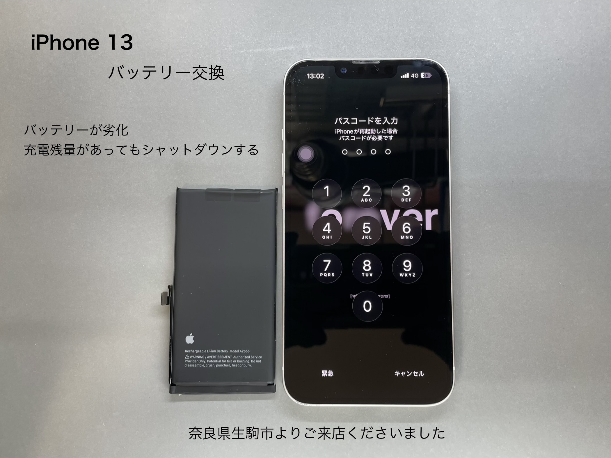 今回ご紹介させて頂きます、iPhone修理は奈良県生駒市からお越しのお客様よりiPhone 13のバッテリー交換のご依頼です。