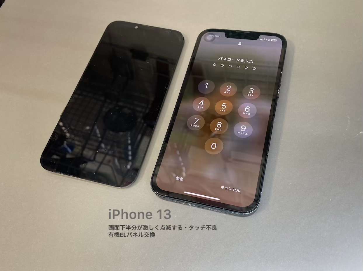 iPhoneの画面は衝撃によって表示不良やタッチ不良が発生することがあります。特に有機ELディスプレイは精密な構造のため、落下のダメージが内部に影響しやすい特徴があります。今回のように点滅やタッチ不良が同時に出ている場合は、画面パネルの交換が必要になるケースが多く見られます。