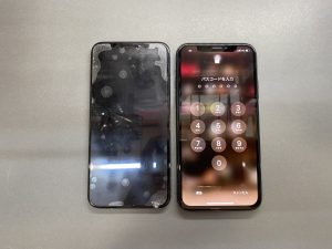 お手元からアスファルトに落下させてしまったということで、拾い上げた時にはタッチ操作ができない箇所があり、画面修理が必要と割れた数日後にお立ち寄り下さいました。ご友人も画面修理で当店をご利用くださったことがきっかけとなり、事前にお問い合わせのご連絡を頂戴しておりました。過去にもガラス割れでiPhone修理店をご利用で、何度か衝撃を受けたことでFaceIDの顔認証は使えなくなってしまっていました。当店でも実際に受付になりましたら、交換作業中には矯正できない歪み・部品交換や移植に際して復活できない可能性がある機能等、お客様には重要なお仕上がりについて、正直にお話しさせて頂いております。