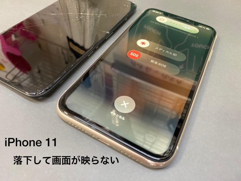 こちらは、iPhone11の画面修理です。木津川からご来店下さいました。iPhoneを落としてしまい、ガラスだけが割れたと思っていたようですが、画面の色がどんどん暗くなりついには真っ暗になってしまったご様子。